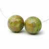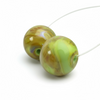 Two handmade glass beads that feature a delightful mix of opaque, creamy light lime green swirled with hints of light brown and a whisper of lilac, creating a captivating creamy shine. Perfectly imperfect in shape, their handmade nature adds a personal touch to any jewelry piece. Ideal for adding a splash of color and character to your designs.