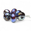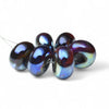 Introducing six bold beads that are created from a striking palette of metallic blacks, deep reds, and iridescent silver blues. These glass beads create a mesmerizing interplay of colors that captivate the eye. Each bead is unique, showcasing a distinct blend of hues and patterns that reflect the light - what ever the environment may be.