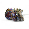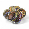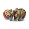 A striking set of 9 disc beads, crafted to blend whimsy with contemporary elegance. Each bead is free-formed to capture an artistic spirit that resonates with individuality. Made from both opaque and transparent glass, these beads showcase a palette where creamy light salmon meets vibrant purples, blues, and greens. Their iridescent shine adds a touch that makes them versatile enough to elevate any design with their playful yet sophisticated charm.